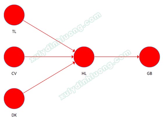 Dùng biểu tượng Connect vẽ mũi tên tác động giữa các biến theo mô hình nghiên cứu. Sau khi chọn vào biểu tượng Connect, nhấp chuột vào biến độc lập để xác định gốc mũi tên, sau đó nhấp chuột vào biến phụ thuộc để xác định đầu mũi tên. Ví dụ, muốn vẽ mũi tên từ TL lên HL, đầu tiên chọn vào biểu tượng Connect, sau đó nhấp chuột vào biến TL, cuối cùng nhấp vào biến HL.