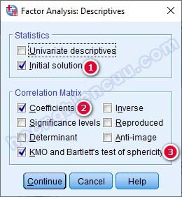 – Descriptives: Tích vào mục KMO and Barlett’s test of sphericity để xuất bảng giá trị KMO và giá trị sig của kiểm định Barlett. Nhấp Continue để quay lại cửa sổ ban đầu.