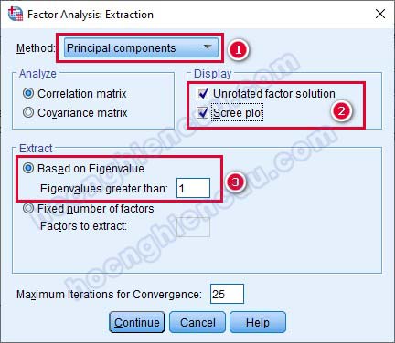 – Extraction: Ở đây, chúng ta sẽ sử dụng phép trích PCA (Principal Components Analysis). Trong SPSS, PCA được viết gọn lại là Principal Components như hình ảnh bên dưới, đây cũng là tùy chọn mặc định của SPSS.