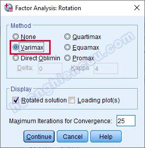 – Rotation: Trong mục này có nhiều phép xoay nhân tố khác nhau, phổ biến nhất là Varimax và Promax. Đối với những đề tài đã xác định rõ biến độc lập và biến phụ thuộc, chúng ta nên sử dụng phép xoay Varimax. Sau khi chọn xong, nhấn Continue để quay lại cửa sổ chính.