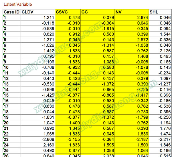Tại bảng Latent Variable, chúng ta copy ba cột dữ liệu LOC gồm CSVC, GC, NV và dán vào tệp .csv dữ liệu đầu vào của SMARTPLS.