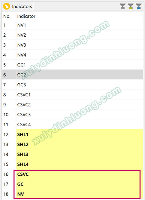 Khi đã đưa lại file dữ liệu mới vào SMARTPLS, check lại phần Incators để xác nhận file dữ liệu đã có mặt các biến CSVC, GC, NV hay chưa.