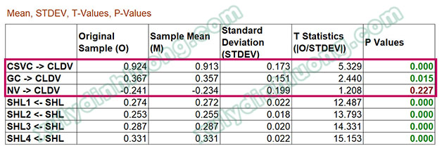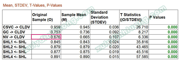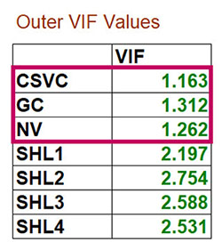 → Outer VIF Values của CSVC, GC, NV đều rất nhỏ (dưới ngưỡng 5). Như vậy, không xảy ra tình trạng cộng tuyến giữa các biến quan sát nguyên nhân của thang đo CLDV.