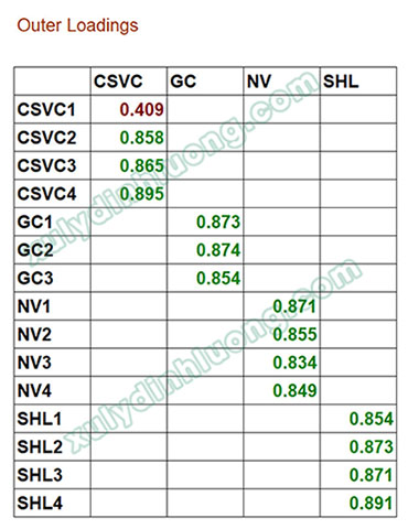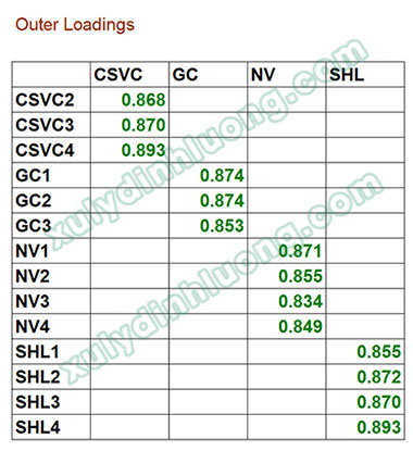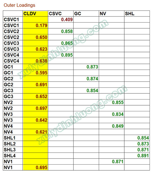 Chúng ta không xét các biến quan sát của biến bậc hai, do vậy sẽ xóa cột CLDV và các hàng biến quan sát tương ứng với giá trị cột CLDV khỏi kết quả xử lý. Bảng Outer Loadings sau khi trình bày lại: