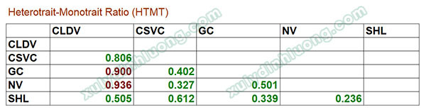 → Giữa các cặp biến LOC, giá trị HTMT đều dưới 0.85, như vậy tính phân biệt giữa các LOC được đảm bảo.